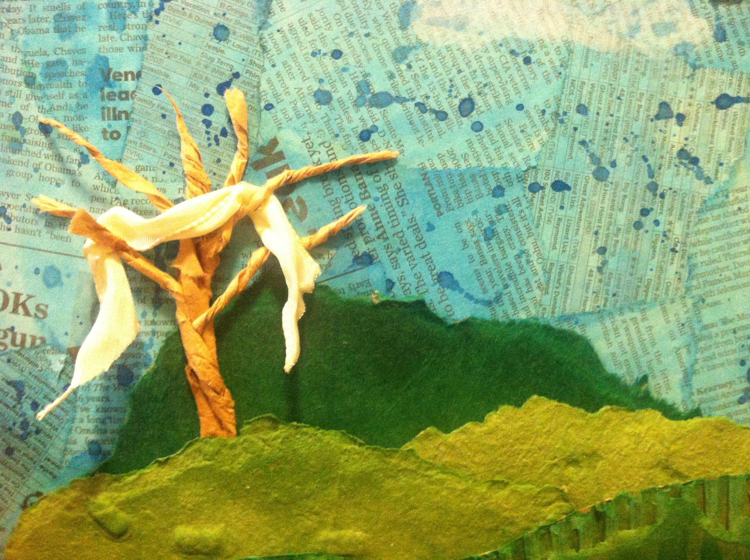 {Cardboard, newspapers, watercolor paint, coffee filters, and ribbon.}