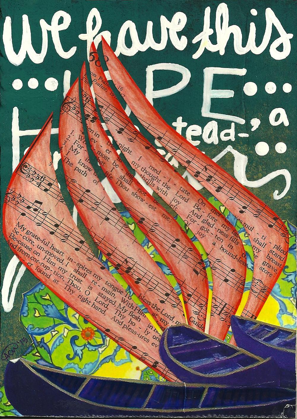 Still thinking about that sure and steadfast anchor, I was flipping through some old calendar pages when I landed on some blue canoes. I liked the way they look, so I cut them out. A few calendar pages later came the yellow and green mandala you see behind the flames. Since I’m ever the fan of old books, they end up being put to use too. I headed toward the topical index in my falling-apart-already red hymnal, looking for the suggestions under “hope.” For the musically curious, the hymn I used is “When In the Night I Meditate.” When I started cutting this page I wasn’t sure if the words would turn into water or fire but, opposite as they are, both seemed fitting. Noticing the flame-colored flowers in the mandala, fire it was. The beginning of Hebrews 6:19 is painted in the background.