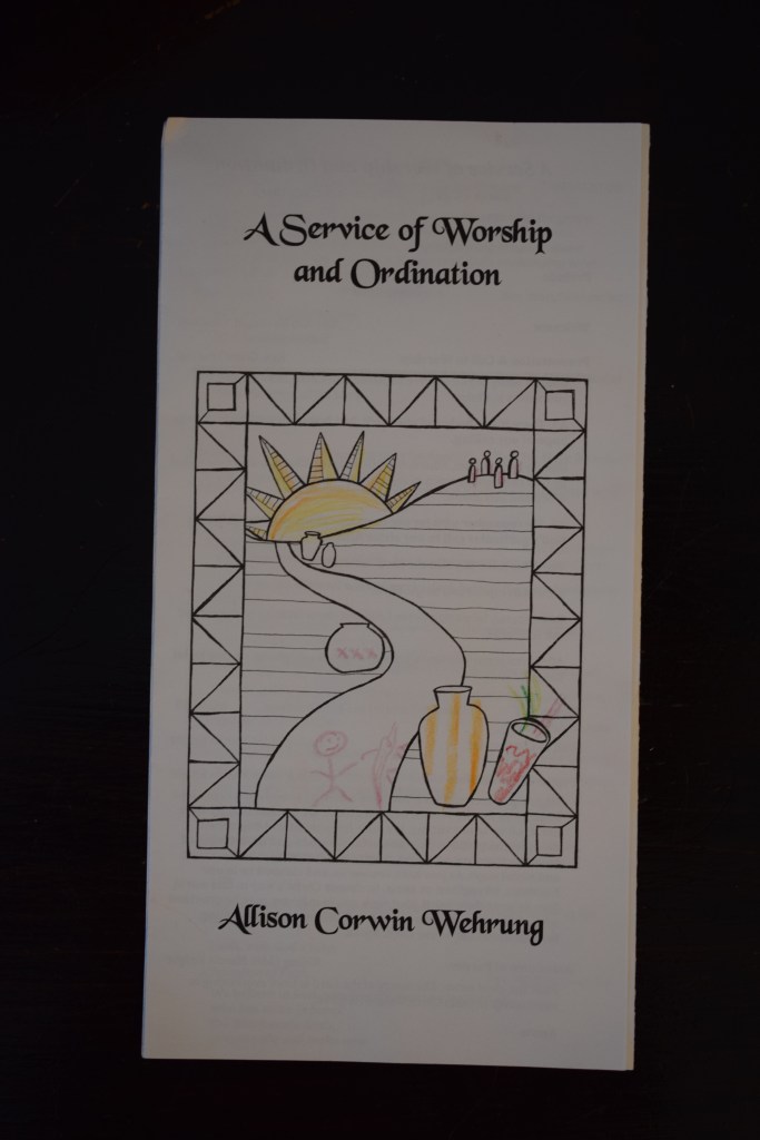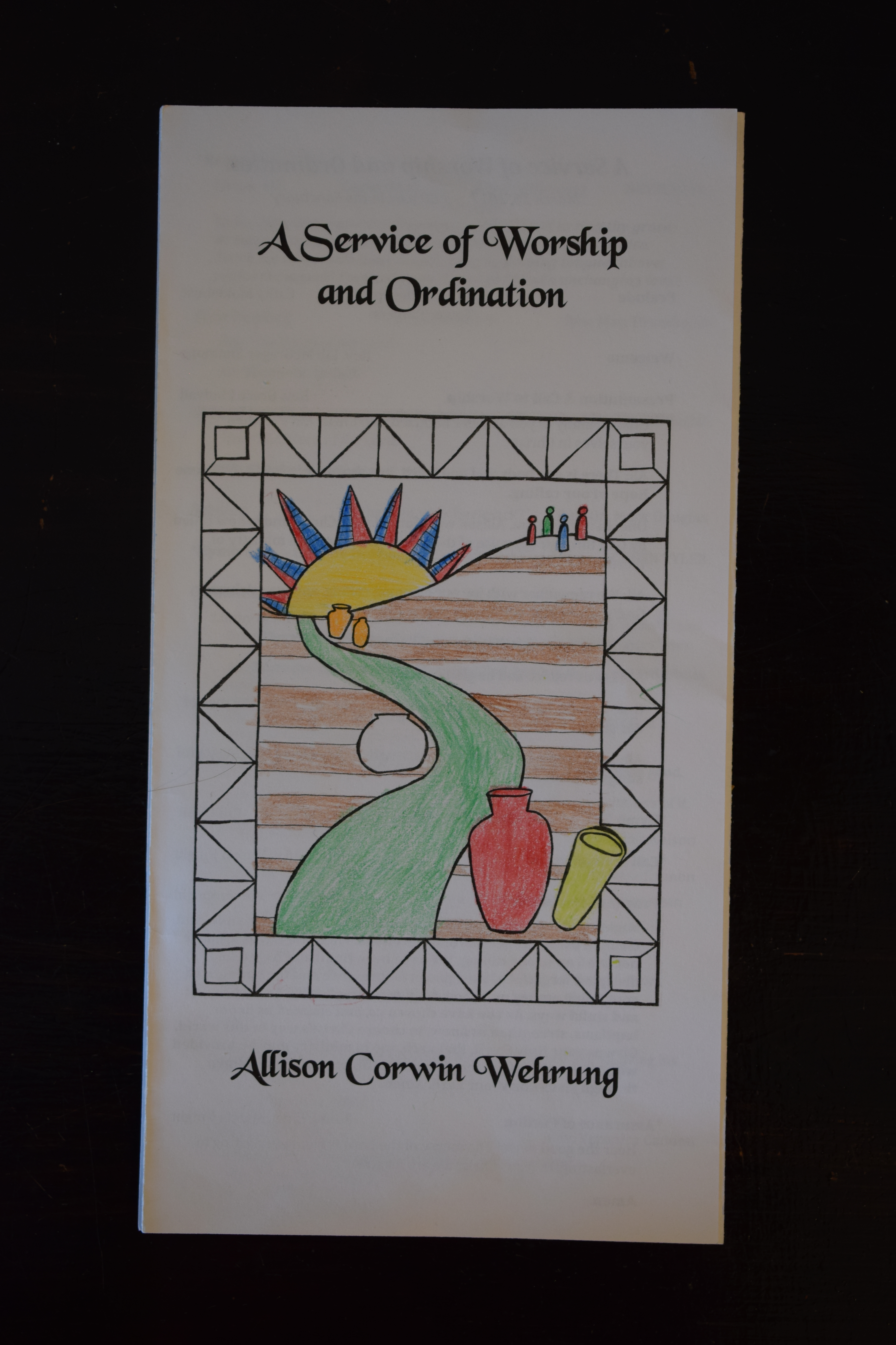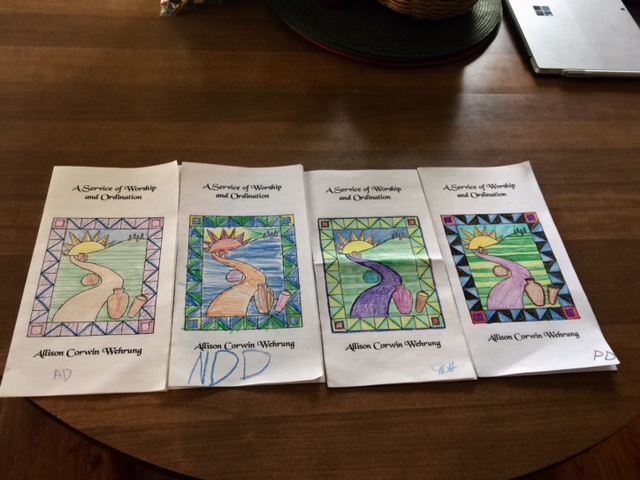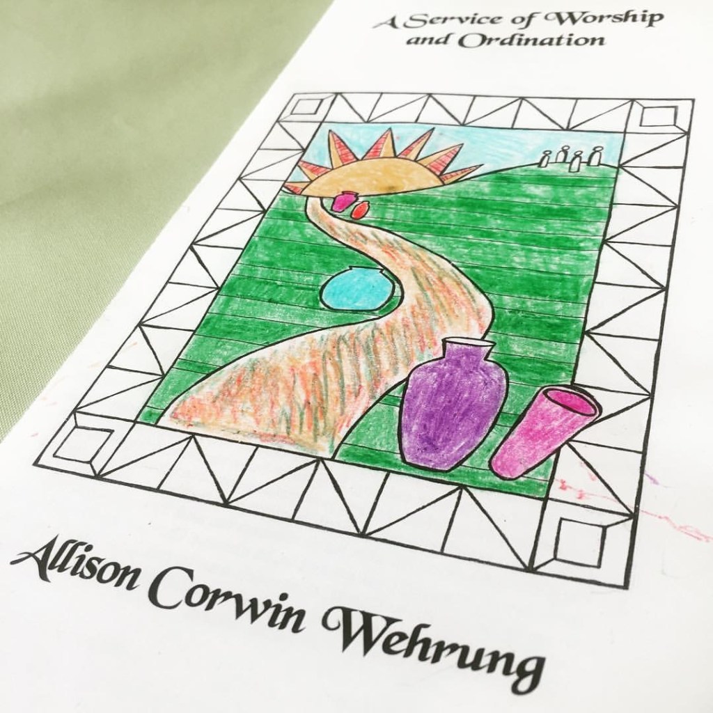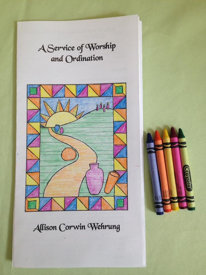 I couldn’t very well plan an authentic ordination service without some color! So I thought I’d let people add their own, and I set out to make the front of the worship bulletin a coloring page. I’m delighted that friends and family played along, even as far away as Ohio! Here are some of the creations people shared, and if you keep scrolling there’s more about the image, along with a PDF you can color yourself.