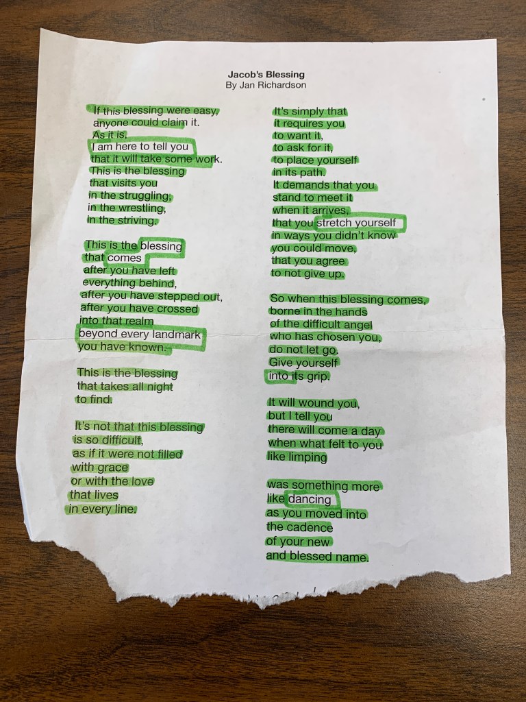 I recently found this one hidden between pages of a book in my office, tucked away for so long I honestly don’t know when or where I made it. (Though chances are good it was either a campus ministry gathering or a camp retreat.) The printed words are “Jacob’s Blessing” by Jan Richardson, inspired by Genesis 32: 22-32.